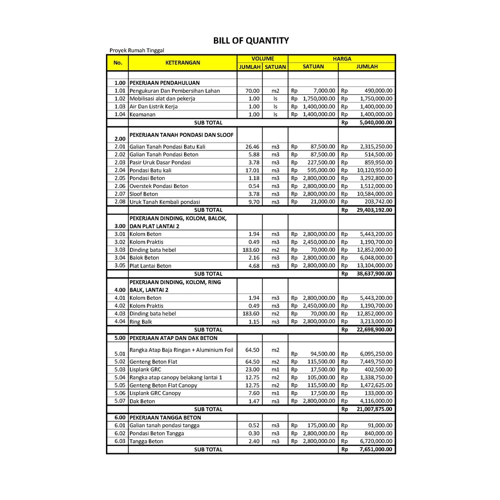 Kontraktor akan menyusun RAB yang komprehensif dan terperinci untuk pembangunan rumah sesuai dengan desain yang telah disetujui oleh Pemilik Rumah.